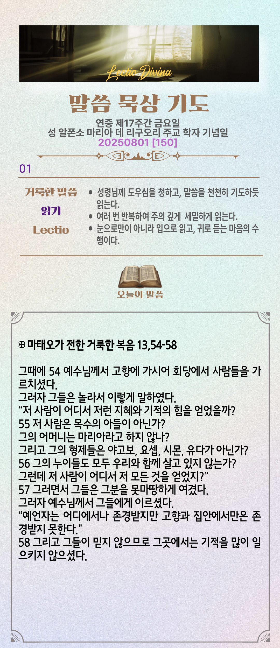 말씀묵상기도 LECTIO DIVINA [150] 연중 제17주간 금요일 |성 알폰소 마리아 데 리구오리 주교 학자 기념일