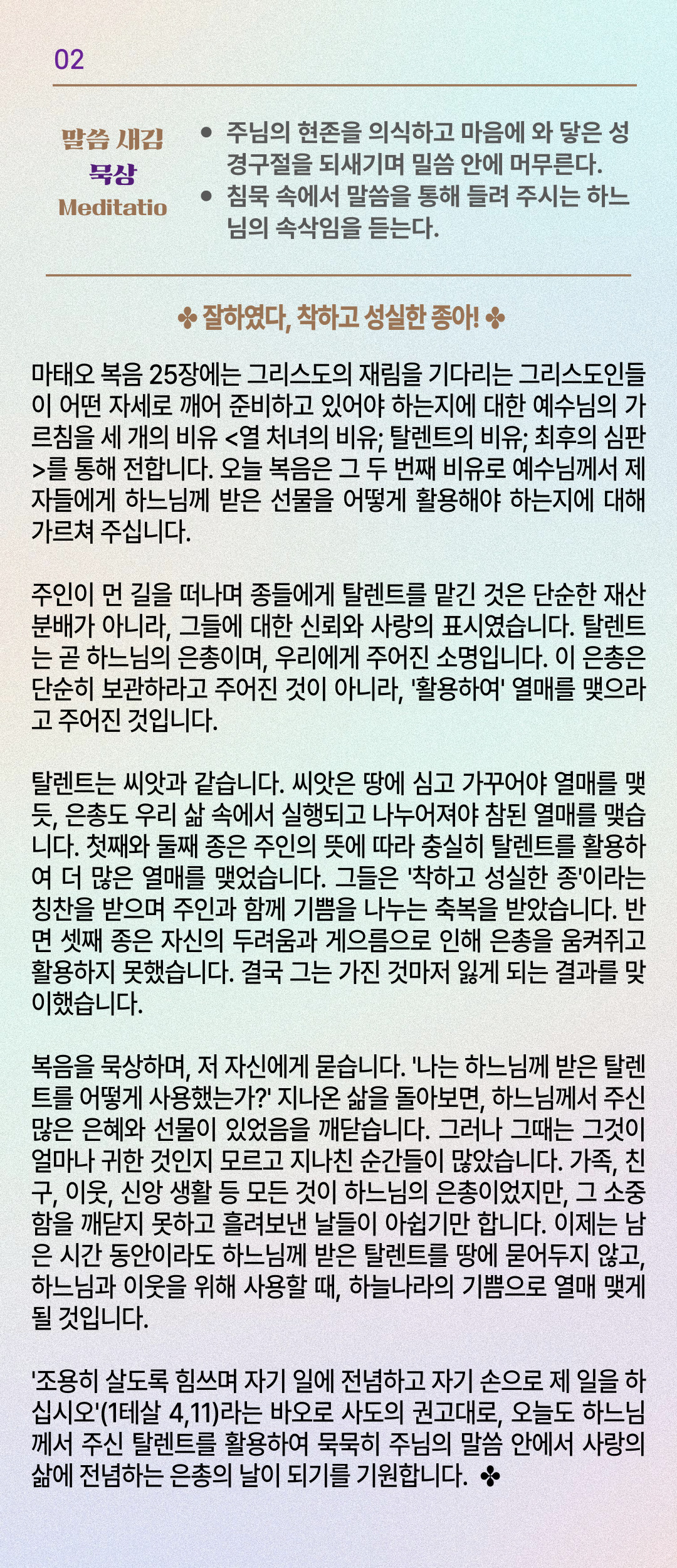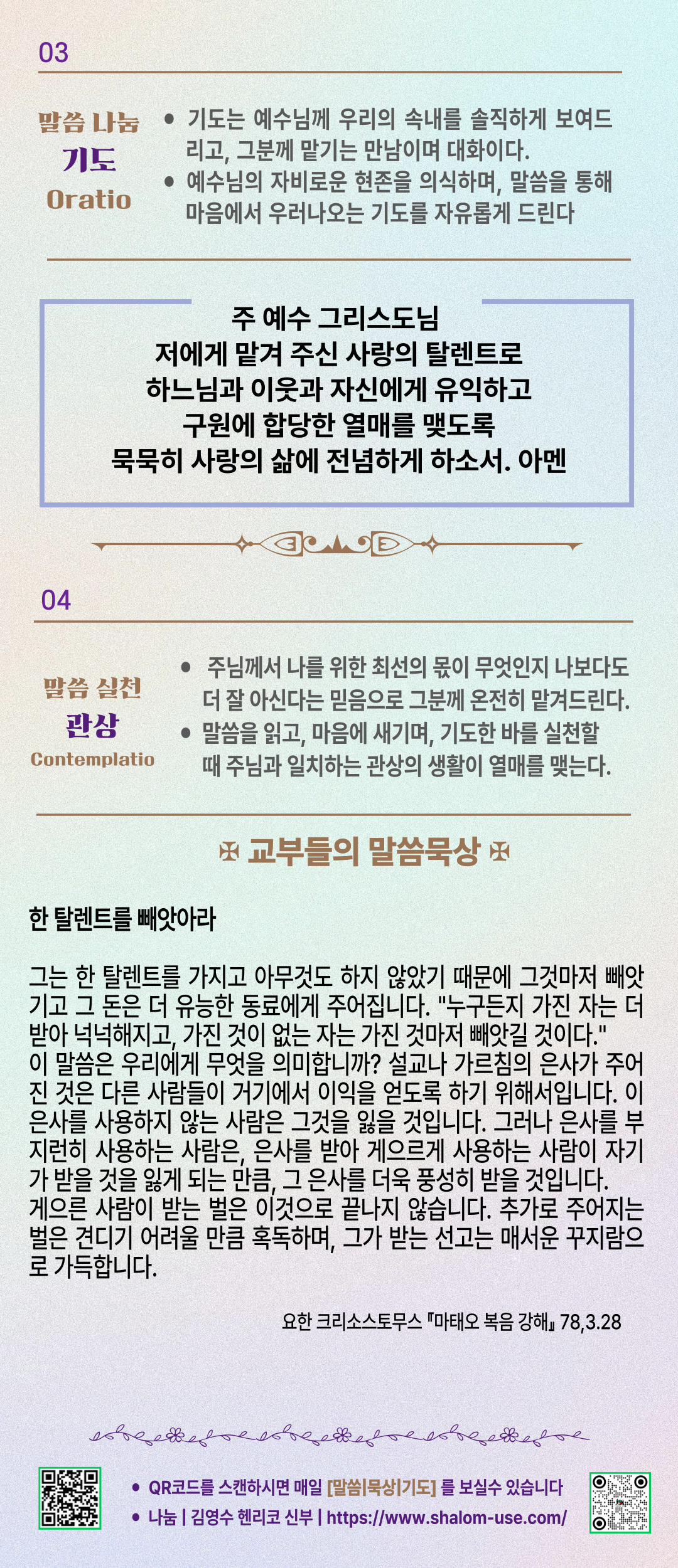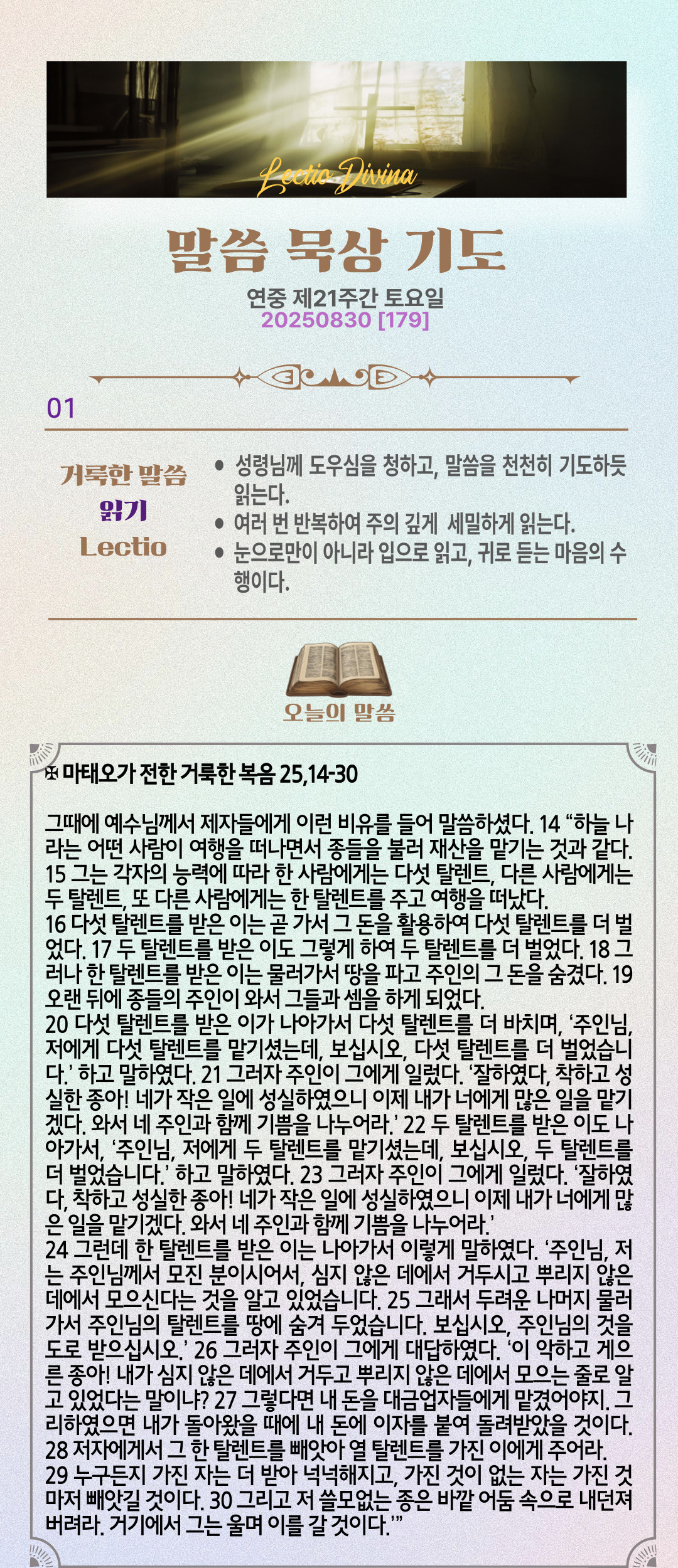 말씀묵상기도 LECTIO DIVINA [179] 20250830 연중 제21주간 토요일